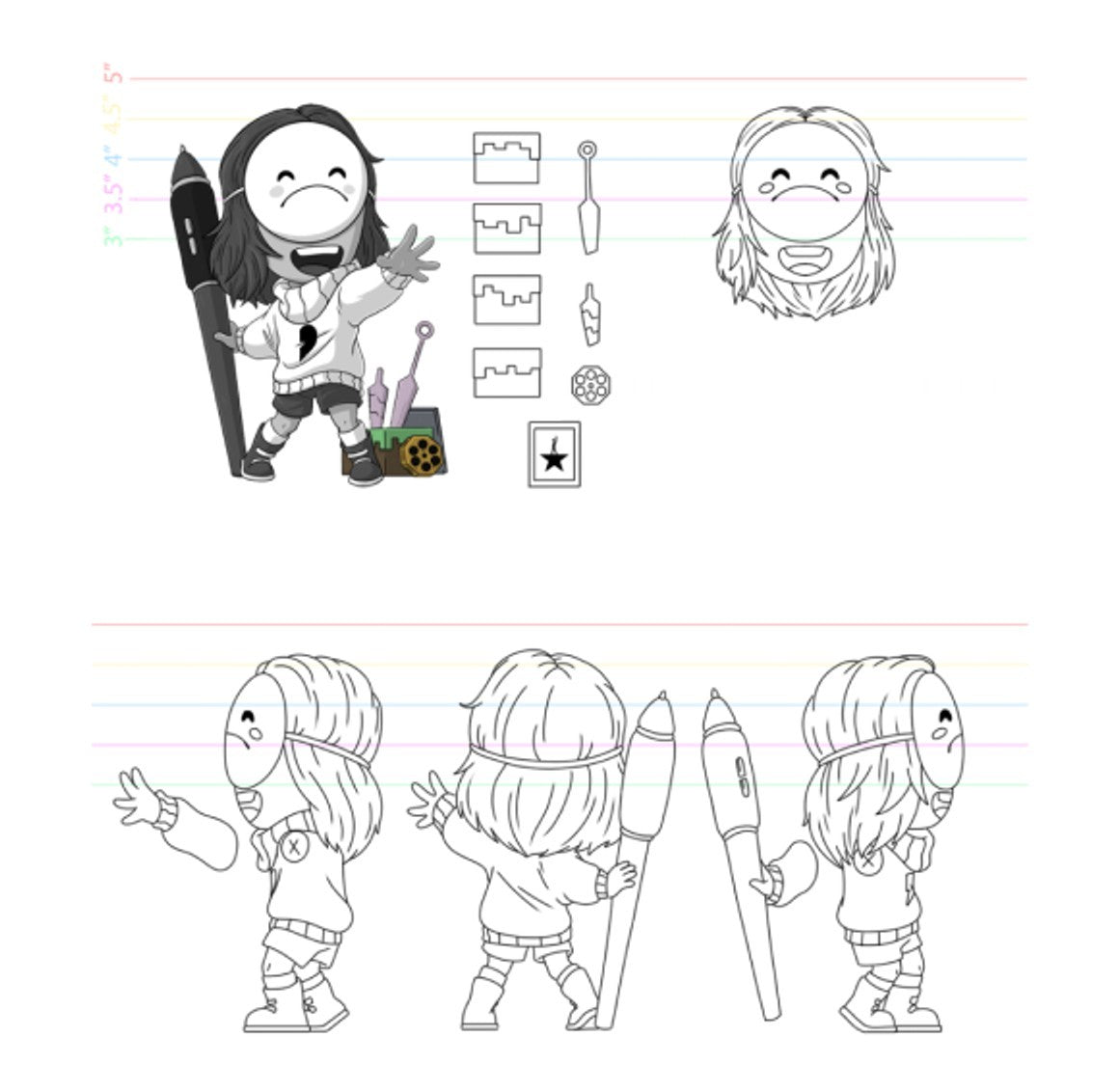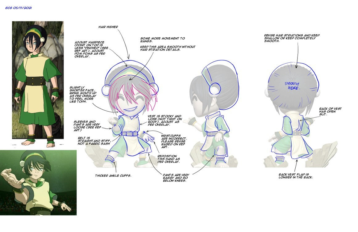 Youtooz in-house artists sketch poses and moments to capture a character in collaboration with the person or team the Youtooz is based on. For many designs we do live sketching sessions with screen-share, review mood-boards, or capture ideas through a form which covers everything head to toe for the Youtooz. The polished concept is then shared with the creator, IP holder, or owner of the character for approval. Usually a few rounds of revisions are made to the concept based on feedback or areas of improvement.