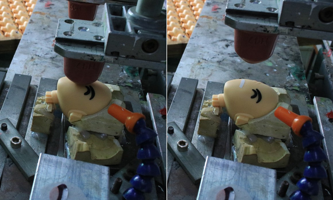 Once a sample has been approved by the creator or IP owner the steel-mold production begins. The steel is cut with a CNC machine to form each part and accessory of the Youtooz. The more complex a design, the longer the mold takes. We've had some that have taken half a year to perfect. Once we're done with a mold, we recycle the steel so it can be reused in making a new figure in the future.
